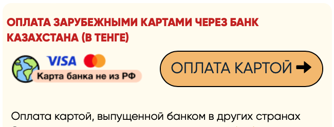 Для оплаты картами, выпущенными банками Казахстана, Беларуси или Украины воспользуйтесь опцией "оплата зарубежными картами через банк Казахстана"