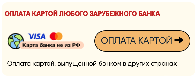 Для оплаты картой, выпущенной за рубежом - воспользуйтесь опцией "оплата картой любого зарубежного банка". Мы принимаем платежи картами Visa и Mastercard, выпущенными в любой стране мира.