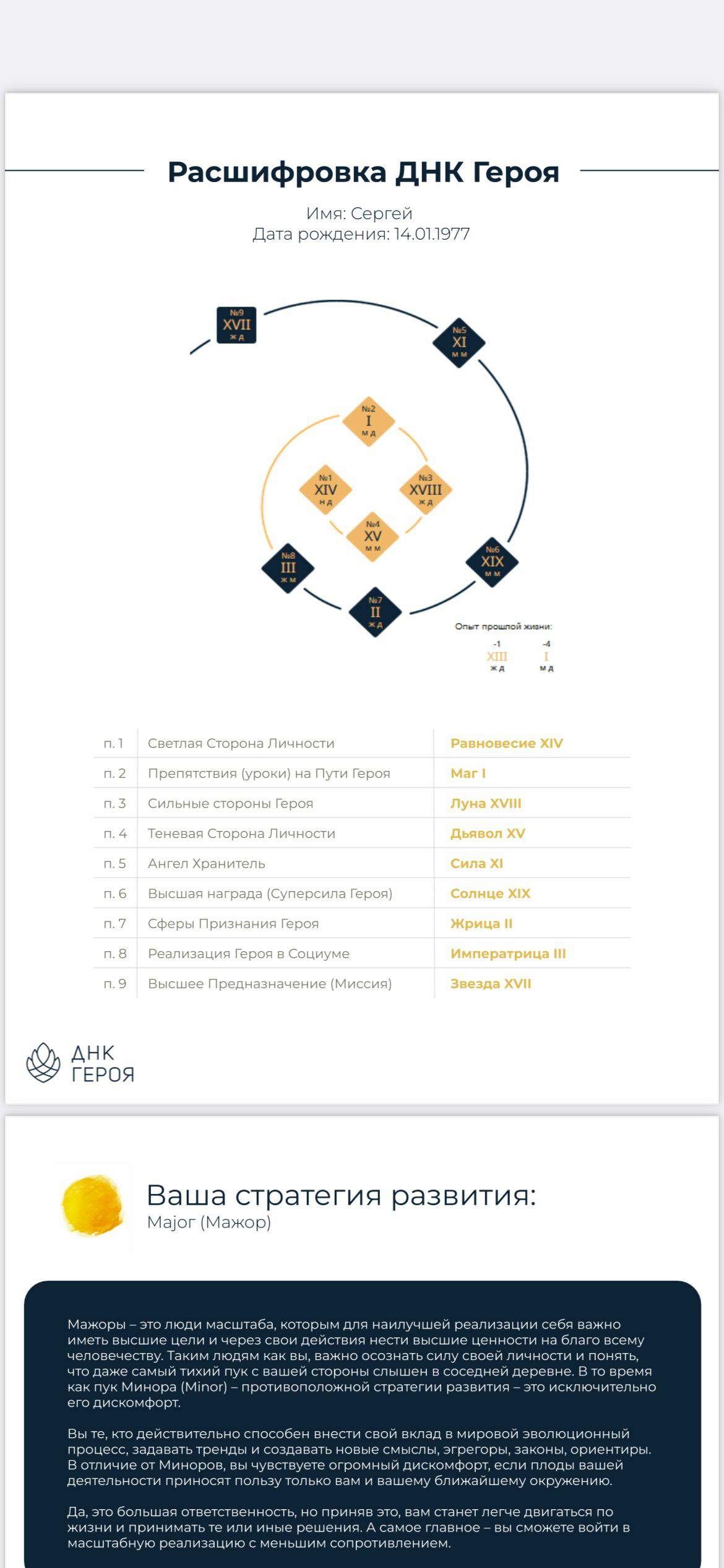 "Расшифровка по ДНК Героя не похожа ни на один расчет, что я делала раньше. Я ожидала увидеть много буков, как в было в матрице, но здесь нет, я увидела свой путь и поняла кем я родилась, а какой меня видят другие и что мне нужно сделать, чтобы повзрослеть. И только после этого можно ожидать больше денег в своей профессии. Это действительно путь, а не набор качеств и сфер, как в матрице я увидела и типа что с этим делать. А тут понятно. И в конце расшифровки мне сказали как надо действлвать, чтобы по уму, а не хаотично и непонятно с каким результатом. Вообщем я поражена, честно. А я в самопознании и дизайне и портрете вообще то искушонный человек. Спасибо! Заказала на дочку, посмотрм какой у малышки путь"