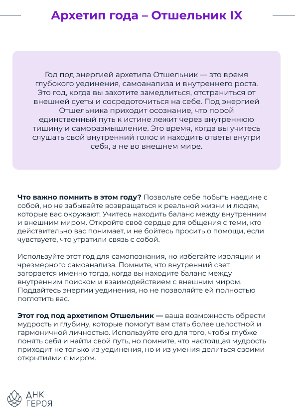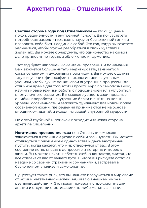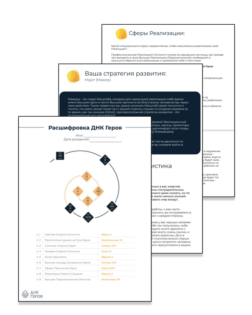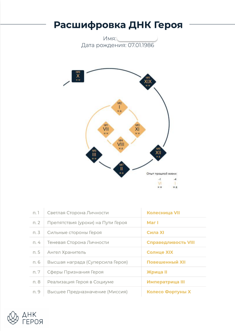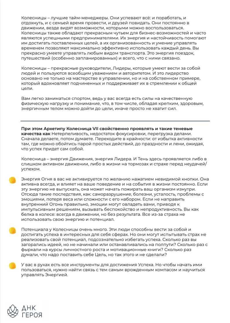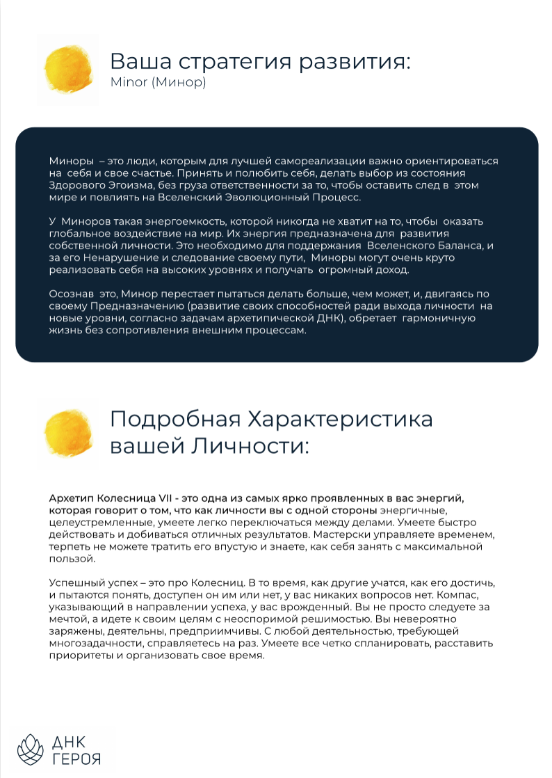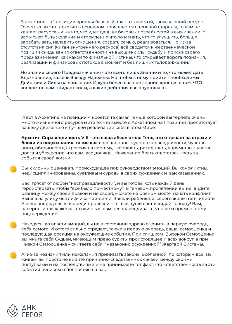 Я удивилась на сколько близок текст, насколько много очевидной информации, которую я о себе знала, но не признавала и естественно открыла какую-то новую часть себя. Я вот думаю, что из-за того что сейчас многое доступно и много всего отвлекающего и искушающего, плюс из-за каких то неудачных опытов, мы часто теряем главное - понимание того, кто мы есть и чего мы хотим и что нужно сделать. И вот это будет как будто бы подсказка. Такой сочный, структурный рассказ, чтобы всегда помнить кто ты и куда тебе стоит идти, где работать, на какие качества опереться, а куда соответственно идти не стоит. Вот, я ее буду называть подсказка, а не расшифровка!))) Спасибо вам!"